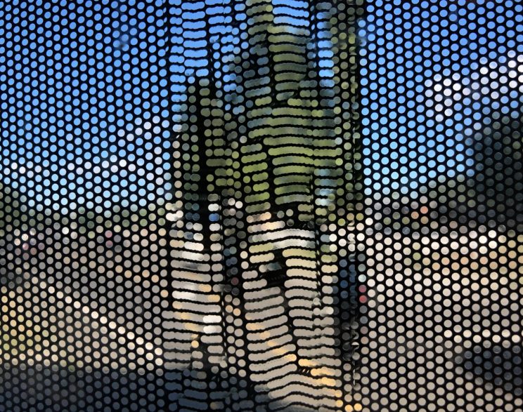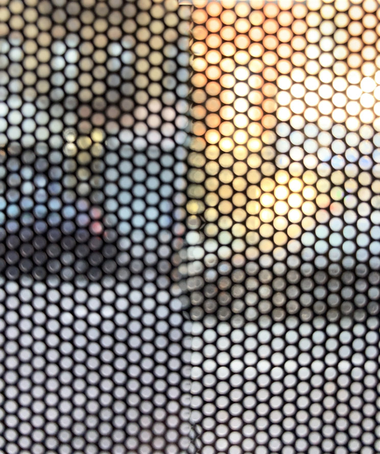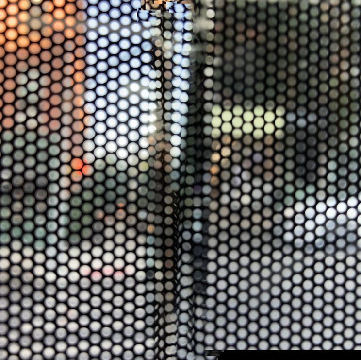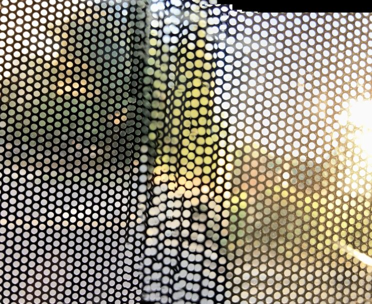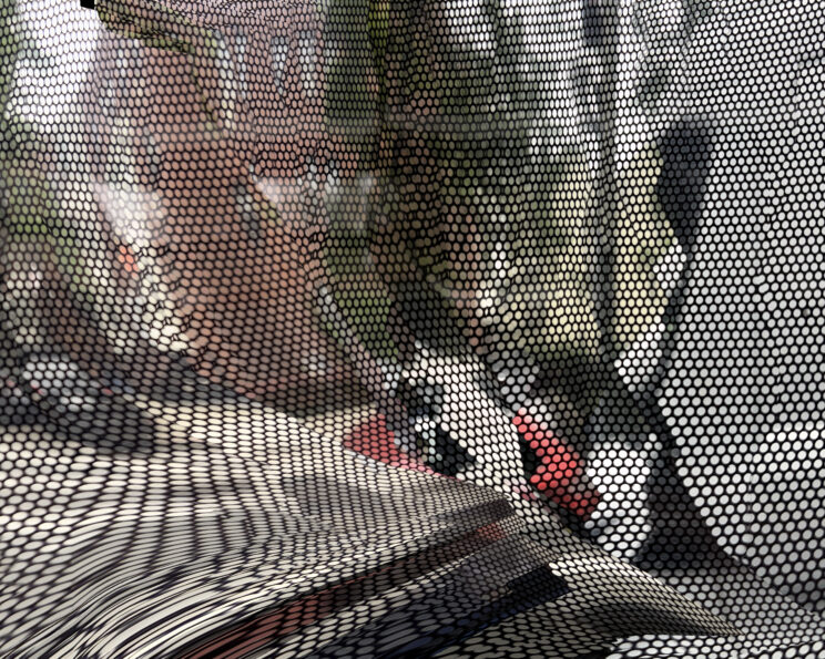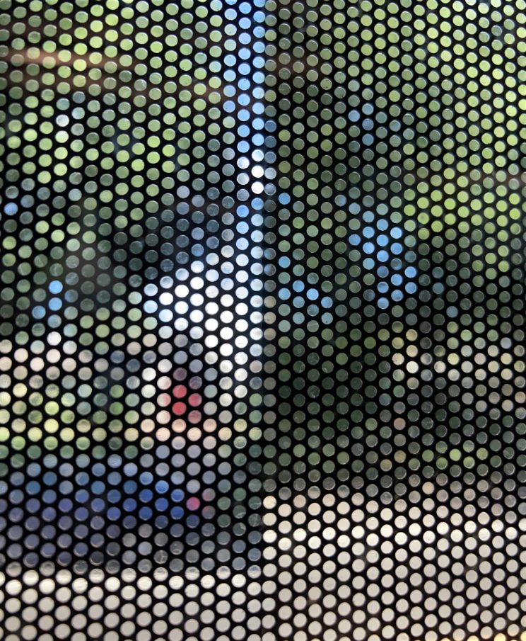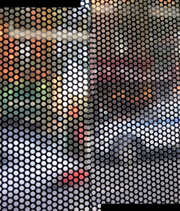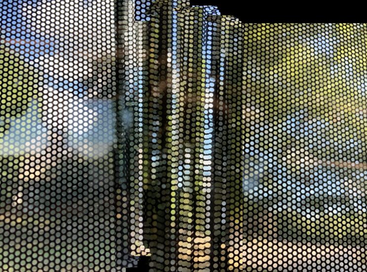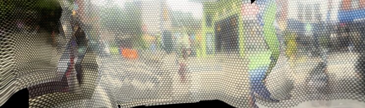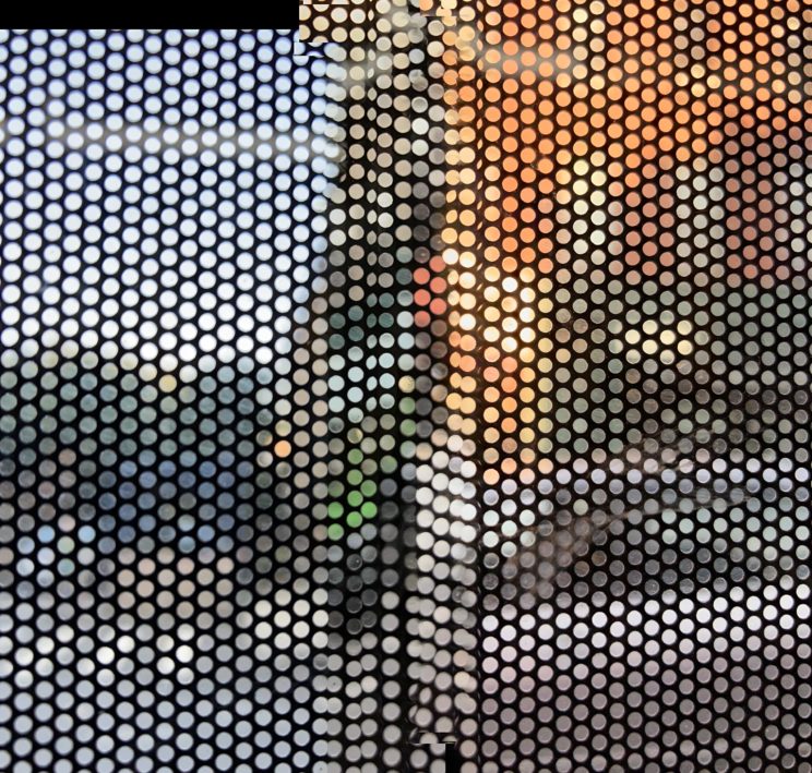 These photos are made through the window of a bus whose exterior is covered with an ad one can see through. Focussed on the ad’s dot pattern, the camera produces abundant and exuberant so-called malfunctions while rendering the scenery. These images are unaltered.