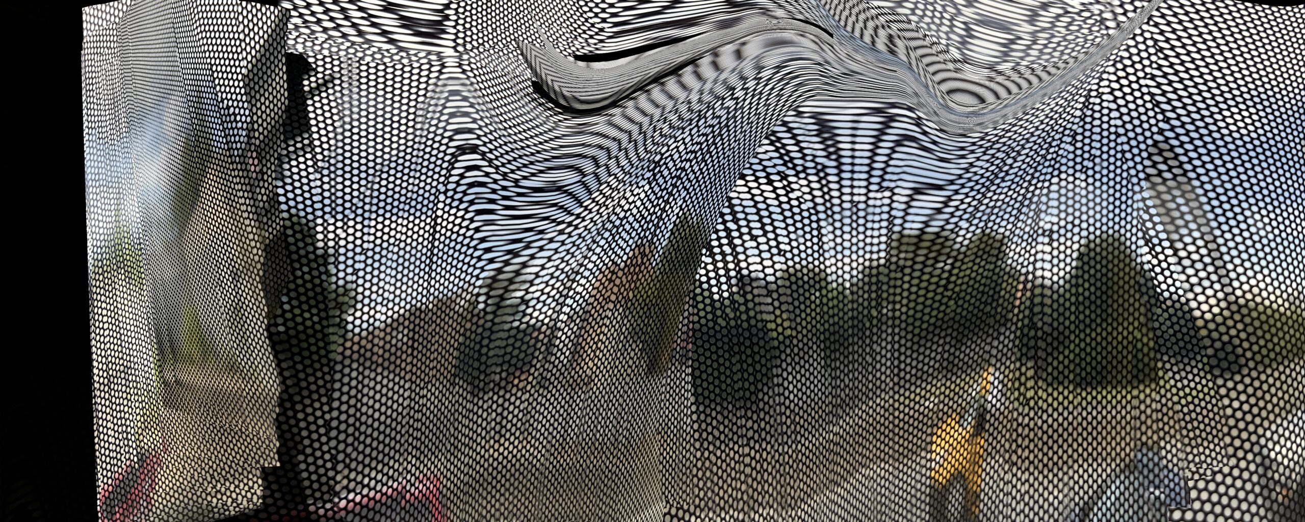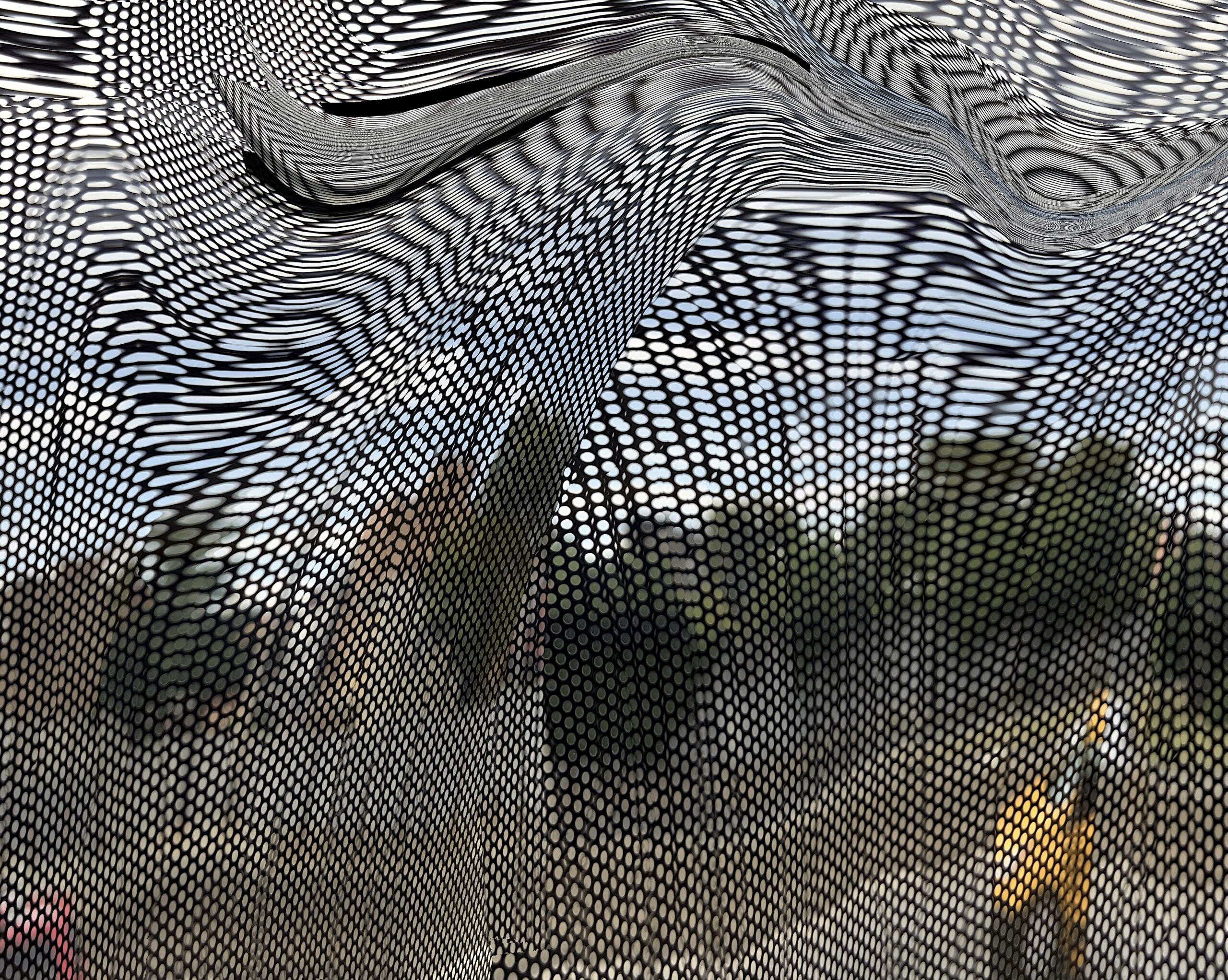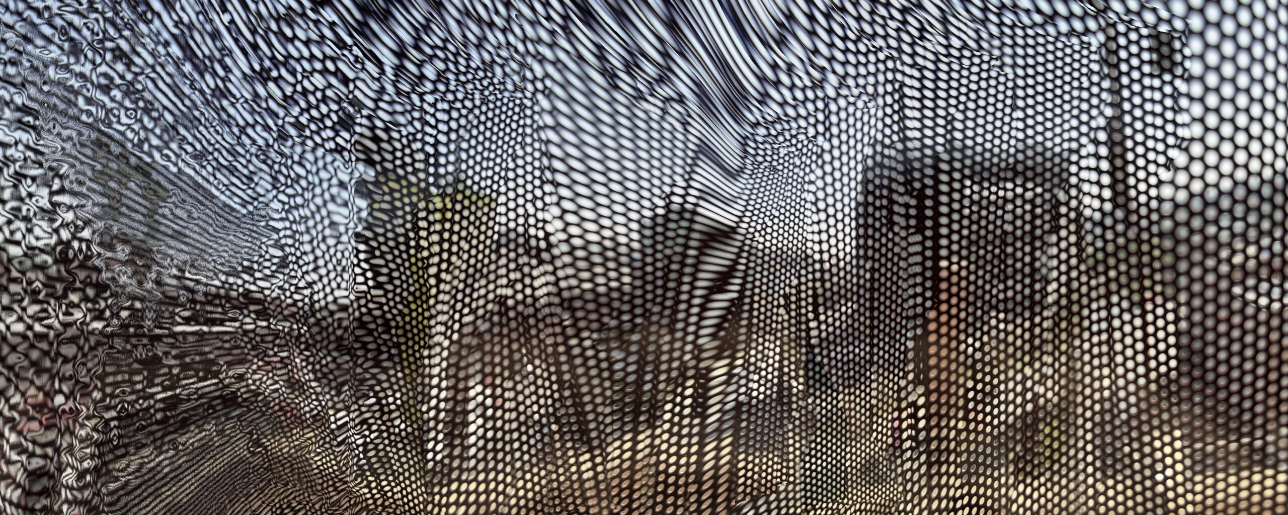 These photos are made through the window of a bus whose exterior is covered with an ad one can see through. Focussed on the ad’s dot pattern, the camera produces abundant and exuberant so-called malfunctions while rendering the scenery. These images are unaltered.